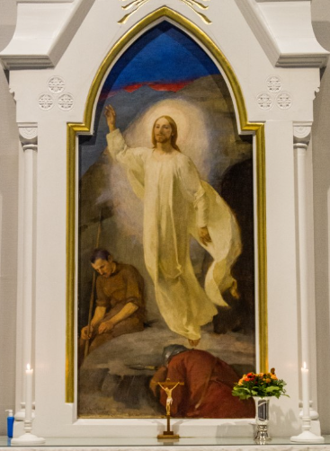 According to the artist's view, the Roman soldiers lost their dayconsciousness from fright and did not react in any way when Jesus emergenced out from his tomb (Matt 28:4,13). In the same way, spiritually asleep humanity does not understand what it means that Jesus conquered death for us (Acts 28:27; Eph 5:14). The way to Heaven, to God the Father, to eternal life has been opened. Faith in Jesus opens our eyes, awakens us from the sleep of death, and moves us onto that path (Eph 1:18).
