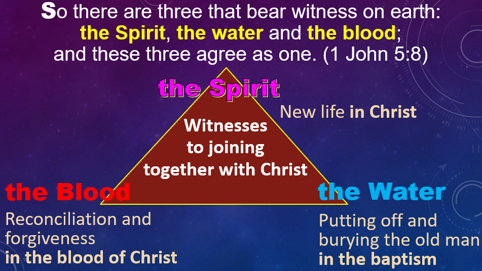 So there are three that bear witness on earth: the Spirit, the water and the blood; and these three agree as one. (1 John 5:8)