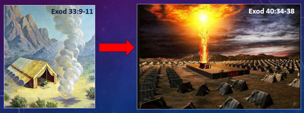 Joshua got to see how the glory of the Lord moved from outside the camp to the center of the camp. First, he watched the Lord descend in fire on Mount Sinai (Exod 20:18; 24:17). Second, he heard the Lord speaking to Moses from the pillar of cloud at the door of the tent outside the camp (Exod 33:9-11). The Bible tells us that both on the mountain and in the tent, Joshua, as Moses' servant, was able to be closer to the glory of the Lord than the other Israelites.