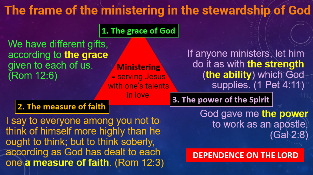 The priestly service in the household of God is also called the stewardship, the administration and the dispensation of God's grace. As the next diagram shows the servant of the Lord is always and in everything dependent on the grace, amount of faith and the power given by God.